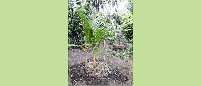 सावलीसाठी नारळ रोपाच्या चारही दिशांना उंच वाढणारी केळी, पपई, एरंडी अगर गिरिपुष्प याची लागवड करावी. पावसाळा सुरू झाल्यानंतरच रोपांची लागवड करावी. आळ्यामध्ये आच्छादन करावे. नारळ रोप लागवडीनंतर काळजी घेणे महत्वाचे आहे. लागवड केल्यानंतर लगेच रोपांना आधार देणे आवश्यक आहे. त्यासाठी वाऱ्याची दिशा लक्षात घेऊन रोपाच्या उंचीपेक्षा थोड्या जास्त उंचीच्या दोन काठ्या रोपापासून ४५ सेंमीवर दक्षिणोत्तर बाजूवर पुराव्यात. त्याला एक अगर दोन काठया आडव्या वाऱ्याच्या विरूध्द दिशेला बांधाव्यात. त्याला रोप इंग्रजी आठ आकडयांच्या गाठीने सैलसर बांधावे. जेणेकरून रोप वायामुळे हलून त्याच्या मुळांना इजा होणार नाही. पहिली दोन वर्षे रोपांचे उन्हापासून संरक्षण करणे आवश्यक असते. त्यासाठी विणलेले झाप, झावळी, गवत, झाडाच्या फांद्या याची कृत्रिम सावली करावी. सावलीसाठी रोपाच्या चारही दिशांना उंच वाढणारी केळी, पपई, एरंडी अगर गिरीपुष्प याची लागवड करावी. पावसाळा सुरू झाल्यानंतरच रोपांची लागवड करावी. पहिलाच पावसात पाणी उपलब्ध आहे म्हणून लवकर लागवड करतात. परंतु पहिल्या पावसानंतर होणाऱ्या उघडिपीमुळे रोपांवर सूर्यप्रकाशामुळे इजा होण्यांचा संभव असतो. खत नियोजन