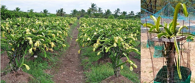 ५ ते ६ फूट उंची, ३.५-४ × ३.५-४ इंच (रुंद/जाड) वजन ४० ते ४५ किलो खांबाच्या टोकावरती एक ८ ते १० एमएम चा रॉड/नट असावा. जो प्लेट बसवण्यासाठी उपयोगी ठरतो. ५०-६० सेंमी लांबी × ५०-६० सेंमी रुंदी × ३-४ सेंमी जाडी) गोलाचा व्यास १२-१५ सेमी प्लेटचे वजन २०-२५ किलोजमिनीचा प्रकार, पाण्याची उपलब्धता याचा अभ्यास करून अंतर निश्चित करावे. ३ × २.५ मीटर आणि ३ × ३ मीटर अंतरावर लागवड करावी.रोप लागवडीपूर्वी सिमेंटचे खांब उभे करून घ्यावेत (३ ते ४ फूट जमिनीवर ठेवावेत) त्यानंतर प्रत्येक खांबाच्या ठिकाणी १०-१५ किलो शेणखत मिसळून वाफे बनवावेत. लागवड करताना, रोपे खांबाच्या जेवढ्या जवळ लावता येतील तेवढी लावावीत. नवीन फुटवा खांबाला योग्य रीतीने बांधता येईल. खांबाच्या चारही बाजूंना एक एक रोप लावावे.रोपास येणारे नवीन फुटवे खांबालगत सुतळीच्या साहाय्याने बांधावेत. या फुटव्यांना खांबाच्या टोकावरती बसवलेल्या चौरस किंवा गोलाकार प्लेटच्या छिद्रांमधून वाढू द्यावे. सुरुवातीच्या काळामध्ये आडवे वाढणारे किंवा जमिनीच्या दिशेने वाढणारे फुटवे काढावेत. जेव्हा सरळ वाढणाऱ्या फांद्या खांबाच्या टोकावरती असणाऱ्या प्लेटपर्यंत पोहोचतील तेव्हा जास्तीत जास्त प्रमाणात परंतु योग्य फुटव्यांना वाढू द्यावे. जेणेकरून अधिक प्रमाणात फळ धारणा होईल. रोगट तसेच सनबर्नने प्रभावित झालेल्या फांद्यांची छाटणी करावी. प्रत्येक वर्षी अनावश्यक फांद्यांची निर्जंतुकीकरण केलेल्या कटर्सने किंवा कात्रीने छाटणी करून बुरशीनाशकाची फवारणी करावी. प्लेटमधून जमिनीकडे वाढलेल्या फांद्यांचा शेंडा कापला असता फांदीवर अधिक प्रमाणात फुटवे निघण्यास मदत होते.फळांची तोडणी झाल्यानंतर छाटणी लवकर करून घ्यावी. या पिकाची पाण्याची आवश्यकता खूप कमी प्रमाणात आहे. हिवाळा व उन्हाळ्यात नियमित अंतराने आवश्यकतेनुसार पाणी द्यावे. परंतु पाण्याची मात्रा एका वेळेस खूप जास्त राहणार नाही याची दक्षता घ्यावी. योग्य वाढ झालेल्या बागेमध्ये एप्रिल-मे महिन्यामध्ये पाण्याचा ताण दिल्याने अधिक प्रमाणात फुलधारणा होण्यास मदत होते. फूल आणि फळधारणा ही पावसाच्या महिन्यात होते. सूक्ष्म सिंचनाचा अवलंब फायदेशीर ठरतो. लागवडीपूर्वी वाफे तयार करताना एका डांबाजवळील चार रोपांसाठी १० ते १५ किलो शेणखत आणि ५०-१०० ग्रॅम डीएपी चारही बाजूंना एकसारखे टाकावे. जमिनीच्या प्रकारानुसार खतांचे प्रमाण निश्चित करावे. राष्ट्रीय अजैविक ताण व्यवस्थापन संस्थेच्या प्रक्षेत्रावर खडकाळ जमिनीमध्ये ड्रॅगन फ्रूटसाठी ५०० ग्रॅम नत्र, ५०० ग्रॅम स्फुरद आणि ३०० ग्रॅम पालाश या प्रमाणात चार भागांमध्ये वितरित करून पहिल्या व दुसऱ्या वर्षासाठी देण्यात आली. ८०० ग्रॅम नत्र,९०० ग्रॅम स्फुरद, ५