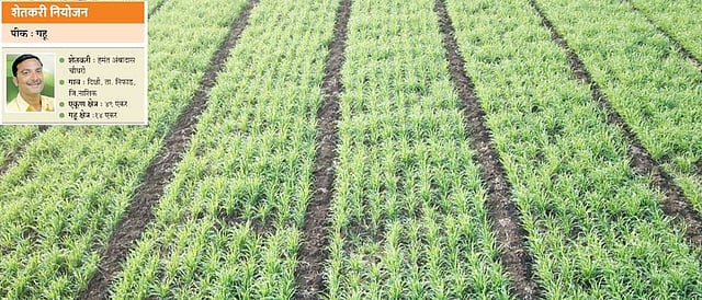 दरवर्षी सेंद्रिय पद्धतीने १० एकर तर रासायनिक खतांचा वापर करून ४ एकरावर गहू लागवडीचे नियोजन असते. सेंद्रिय पद्धतीच्या प्लॉटमध्ये कोणत्याही रासायनिक खतांचा वापर करत नाही. त्यामुळे सेंद्रिय गव्हास मागणी असलेला मोठा ग्राहकवर्ग मला मिळाला आहे. उत्तम चव आणि योग्य पॅकिंगमुळे गव्हास मोठी मागणी आहे. शे तकरी : हेमंत अंबादास चौधरी गाव : दिक्षी, ता. निफाड, जि.नाशिक एकूण क्षेत्र : ४९ एकर गहू क्षेत्र : १४ एकर मी वर्षभर भाजीपाला पिकांसह द्राक्ष, पेरू, डाळिंब ही फळपिके घेत असतो. रब्बी हंगामात प्रामुख्याने गहू पिकासह हरभरा, ज्वारीची लागवडही असते. सर्व पिकांमध्ये शास्त्रीय पद्धतीने व्यवस्थापन करून दर्जेदार उत्पादन घेण्यावर माझा विशेष भर असतो. दरवर्षी सेंद्रिय पद्धतीने १० एकर तर रासायनिक खतांचा वापर करून ४ एकरावर गहू लागवडीचे नियोजन असते. सेंद्रिय पद्धतीच्या प्लॉटमध्ये कोणत्याही रासायनिक खतांचा वापर करत नाही. त्यामुळे सेंद्रिय गव्हास मागणी असलेला मोठा ग्राहकवर्ग मला मिळाला आहे. उत्तम चव आणि योग्य पॅकिंगमुळे गव्हास मोठी मागणी आहे. गहू लागवडीसाठी हवामान बदलास अनुकूल, अधिक उत्पादकता, तांबेरा प्रतिरोधक व चव या मुख्य बाजू पडताळून वाणाची निवड केली जाते. त्यानुसार ३ नावीन्यपूर्ण वाणांचा पेरणीसाठी वापर केला जातो. या अनुषंगाने सेंद्रिय पद्धतीच्या प्लॉटमध्ये मध्यप्रदेश व तमिळनाडू राज्यातून आणलेल्या स्थानिक वाणांची पेरणी करतो. या वाणांच्या ओंब्या अतिथंडीमध्ये पिवळ्या पडत नाहीत, तसेच तापमान वाढीचा कोणताही परिणाम या वाणांवर होत नसल्याचा माझा अनुभव आहे. यावर्षीचे नियोजन