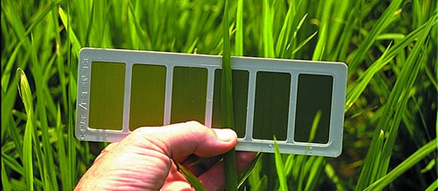 भारतीय भात संशोधन केंद्राची भातासाठी शिफारस १. लीफ कलर चार्ट वापरून रोप लागवडीनंतर १४ दिवसांपासून ते फुलोऱ्यापर्यंत दर आठवड्याला नोंदी घ्याव्यात. २. जर नोंद ३ पेक्षा कमी आढळल्यास एकरी २५ किलो नत्र द्यावे. ३. यासाठी पिकाच्या सर्वात वरील व परिपूर्ण वाढलेल्या पानाचा रंग लीफ कलर चार्टसोबत तपासावा. त्यासाठी पानाचा मध्य भाग चार्टवर ठेवावा. ४. नोंद घेताना आपल्या शरीराने सूर्यप्रकाश अडवून सावली चार्ट व पानांवर पडेल, असे पाहावे. नोंद अचूकतेने घेता येईल. ५. प्रत्येक प्रक्षेत्रामध्ये १० नोंदी घेऊन त्याची सरासरी काढावी. वापराचे फायदे