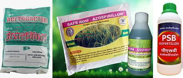 ६) अझोला : ही पाणवनस्पतीच्या पेशीत नेचेवर्गीय अॅनाबेना अझोली हे निळे-हिरवे शैवाल सहजीवी पद्धतीने वाढते. ही वनस्पती प्रकाश संश्लेषण पद्धतीने अन्न तयार करते. त्याच प्रकारे शैवाल हवेतील नत्र स्थिर करून अझोलात साठवते. अझोलामुळे प्रति हेक्टरी २० ते ४० किलो नत्र मिळते. भारतात अझोलाची अझोला पिनाटा ही जात सर्वत्र आढळते. ७) स्फुरद विरघळणारे जिवाणू (Posphate solubilizers): काही जिवाणू मातीतील घट्ट स्वरूपातील स्फुरदाचे विघटन करून त्याचे पाण्यात विद्राव्य स्वरूपात रूपांतर करतात. जमिनीमध्ये बद्ध झालेल्या स्फुरदाची पिकांना उपलब्धता करून देतात. परिणामी स्फुरदयुक्त रासायनिक खतांची बचत होते. उत्पादनात १५ ते २० टक्क्यांनी वाढ करतात. स्फुरदमुळे कर्बयुक्त पदार्थ तया करण्याची प्रक्रिया जोमाने होते. पिकांच्या मुळाची जोमदार वाढ होते. पीक फॉस्फरिक ॲसिडच्या रूपाने स्फुरद घेतात. काही जिवाणू सायट्रिक आम्ल, लॅक्टिक आम्ल, फ्यूमारिक आम्ल, फॉस्फेटच्या द्रवात रूपांतर करून पिकास उपलब्ध करून देतात. उदा. बॅसिलस, सुडोमोनास इत्यादी. स्फुरद विरघळणारे जिवाणू खते वापरल्यास सोयाबीन, भुईमूग, हरभरा व बटाटा उत्पादनात लक्षणीय वाढ होते. जैविक खते वापरण्याचे फायदे ः
