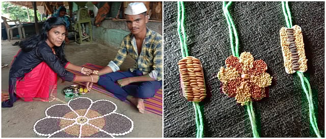 अकोले, जि. नगर : ‘सोनियाच्या ताटी, उजळल्या ज्योती, ओवाळीते भाऊराया रे, वेड्या बहिणीची वेडी ही माया,’ भाऊ आणि बहीण यांच्यातील पवित्र नात्याचा सण असलेला रक्षाबंधन देवगाव येथील बहिणीने अनोख्या पद्धतीने साजरा केला. राखीच्या माध्यमातून बीजबंधन बांधून आपल्या लाडक्या भाऊरायाला तीने ओवाळले आणि बीज महत्त्व विषद केले... रक्षाबंधनसणानिमित्त बहीण आपल्या भावाला ओवाळण्यासाठी व राखी बांधण्यासाठी या दिवसाची आतुरतेने वाट पाहत असते. भावा-बहिणीचे प्रेम आणि ऋणानुबंध घट्ट करणारा हा सर्वांत महत्त्वाचा सण मानला जातो. या सणाचे औचित्य साधून आदिवासी भागातील क्रांतिवीर राघोजी भांगरे यांचे जन्मगाव असलेले देवगाव येथील देवराम भांगरे व ममताबाई भांगरे यांची कन्या आरती हिने आपला भाऊ प्रसाद याच्यासाठी जगावेगळी राखी बनवली आणि रक्षाबंधन सण साजरा केला. याकरिता अंगणात भव्य अशी बियाण्यांपासून तयार केलेली रांगोळी साकारली आहे. विविध रंगछटा आणि आकारातील बियांचा अतिशय कुशलतेने वापर करून ही रांगोळी साकारण्यात आली. विशेष म्हणजे हातामध्ये बांधण्यासाठी तयार करण्यात आलेली राखी ही सुद्धा नैसर्गिक संसाधनांचा वापर करून व पारंपरिक बियाण्यांचा वापर करून बनवण्यात आली होती. ही कला आरती हिला तिच्या आईकडून म्हणजेच जगप्रसिद्ध अन्नमाता श्रीमती ममताबाई देवराम भांगरे यांच्याकडून मिळाली आहे. रात्री उशिरापर्यंत जागून बीज रांगोळी आपल्या घरासमोर आरती हिने साकारली. आपल्या भावाला आगळीवेगळी भेट देण्यासाठी तिने कठोर परिश्रम घेत एक वेगळ्या पद्धतीने रक्षाबंधन सण साजरा केला आहे. आपल्या वाडवडिलांकडून आदर्श घेत पुढचीही पिढी पारंपरिक बियाणे व शेती यांच्याकडे अतिशय सकारात्मक दृष्टीने पाहत असल्याचे हे उदाहरण आहे. परिसरातील महिला आणि ग्रामस्थ ही रांगोळी पाहण्यासाठी मोठ्या प्रमाणावर गर्दी करत आहेत.