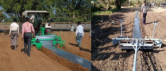 मल्चिंग पेपर अंथरण्यासाठी ट्रॅक्टरचलित मल्च लेयिंग यंत्राचा वापर करावा.यंत्राच्या वापरामुळे वेळ, मजूर व श्रमात बचत होते. मल्चिंग पेपर चांगल्याप्रकारे अंथरला जातो.यंत्राच्या वापरामुळे बेसल डोस देणे, गादीवाफा तयार करणे (६ ते ८ इंच उंची आणि ३० ते ३४ इंच रुंद), लॅटरल टाकणे, पेपर अंथरून कडेने माती लावणे ही कामे करता येतात. साधारणपणे दोन तासांत एक एकर क्षेत्रावर मल्चिंग पेपर अंथरता येतो.मजुराच्या साह्याने वरील सर्व कामासाठी साधारणतः ८ ते ९ हजार रुपये प्रती एकर इतका खर्च येतो. तसेच या कामांसाठी दीड ते दोन दिवस लागतात. परंतू या यंत्राचा वापर केल्यास एक ते दीड तासात सर्व कामे एक ड्रायवर आणि एक मजुराच्या साह्याने पूर्ण होतात. आच्छादन करण्यासाठी मर्यादा आणि फायदे ः