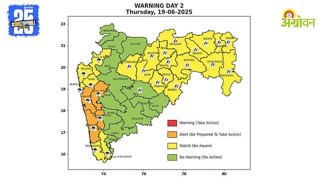 आज (ता. १९) रायगड, रत्नागिरी, सिंधुदुर्ग, पुणे घाटमाथा, सातारा जिल्ह्यांच्या घाटमाथ्यावर जोरदार पावसाची शक्यता असल्याने दक्षतेचा इशारा (ऑरेंज अलर्ट) आहे. पालघर, ठाणे, मुंबई, सिंधुदुर्ग, नाशिक घाटमाथा, कोल्हापूर जिल्ह्यांच्या घाटमाथ्यावर जोरदार पावसाचा अंदाज, मराठवाडा आणि विदर्भात विजांसह वादळी पावसाची शक्यता असल्याने सतर्कतेचा इशारा (येलो अलर्ट) देण्यात आला आहे. उर्वरित राज्यात तुरळक ठिकाणी हलक्या पावसाची शक्यता आहे.