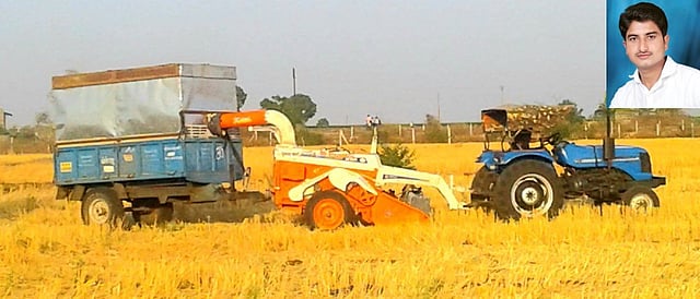 ‘हार्वेस्टर’द्वारे गहू काढणी झाल्यानंतर मोठ्या प्रमाणात अवशेष शिल्लक राहतात. ‘स्ट्रॉ रीपर’द्वारे भुस्सानिर्मिती व पशुखाद्यासाठी त्याचा वापर असा कौशल्यपूर्ण व्यवसाय गाजरवाडी (जि. नाशिक) येथील युवा शेतकरी नितीन धुमाळ यांनी सुरू केला आहे. हंगामी रोजगारनिर्मितीसह त्यातून चांगली उत्पन्ननिर्मितीही साध्य झाली आहे. नाशिक जिल्ह्यात निफाड तालुक्यातील गाजरवाडी येथील नितीन खंडेराव धुमाळ यांची १३ एकर शेती असून, २०१२ पासून ते पूर्णवेळ शेती करतात. ऊस, कांदा, गहू व भाजीपाला ही त्यांची प्रमुख पिके. घरी ३० वर्षांपासून ट्रॅक्टरचा वापर सुरू होता. निफाड हा गहू उत्पादक तालुका म्हणून राज्यात प्रसिद्ध आहे. सोंगणी, मळणी किचकट असल्याने अलीकडील काळात काढणीसाठी श्रम व वेळ वाचविण्यासाठी शेतकरी ‘हार्वेस्टर’चा वापर करतात. मात्र काढणीपश्चात गव्हाचे काड शेतात पडून राहते. यातून जनावरांसाठी पूर्वीसारखा भुसा मिळत नाही. पुढील हंगामासाठी मशागत करतानाही अडचणी येतात. त्यामुळे अनेक जण काड जाळून टाकतात. परिणामी प्रदूषण होते. जमिनीआड न गेल्याने सेंद्रिय कर्ब वाढीसाठी उपयुक्त हा घटकही वापरात येत नाही. नितीन यांच्या लक्षात या बाबी आल्या. पशुखाद्य म्हणून वापरात येण्यासाठी गव्हाच्या या काडांपासून भुस्सानिर्मिती करण्याची कल्पना त्यांना उमगली. तशा यंत्राची यू-ट्यूबवर माहिती शोधताना ‘स्ट्रॉ रिपर’ यंत्राबाबत अधिक माहिती झाली. उपलब्धतेसाठी थेट पंजाब गाठले. तीन वर्षांपूर्वी दोन लाख ७० हजार रुपये किंमत असलेले यंत्र शेतापर्यंत आणण्यासाठी साडेतीन लाख रुपये खर्च आला. व्यवसायाचे स्वरूप नितीन यांनी २०१९ मध्ये व्यवसाय सुरू झाला. ज्या शेतकऱ्यांच्या शेतातून भुस्सा घ्यायचा त्यांना प्रक्रियेत उपलब्ध झालेले गहू दिले जातात. तर ज्या शेतकऱ्यांना भुस्सा करून हवा आहे त्यांच्याकडून एकरी साडेतीन हजार रुपये शुल्क आकारले जाते. अर्थात वाहतुकीचे अंतर व इंधन व व्यक्तींची संख्या यावर दर बदलू शकतात. यंत्राच्या कार्याचे स्वरूप