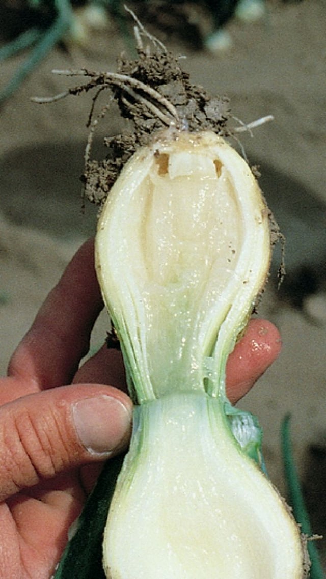 हा रोग जिवाणूंमुळे होतो आणि कांदा आतून मऊ पडतो. सडलेल्या कांद्याला वास येतो आणि पाणी सारखं द्रव बाहेर पडतं.