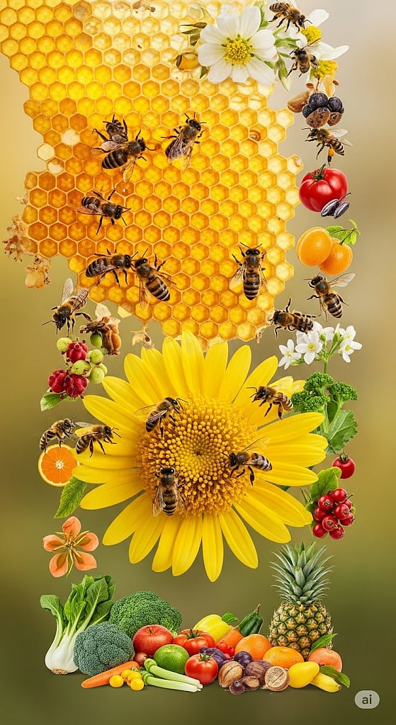 मधमाश्या फुलांचे परागीकरण करतात, ज्यामुळे फळे, भाज्या आणि पिकांची उत्पादकता वाढते आणि जैवविविधता टिकते.