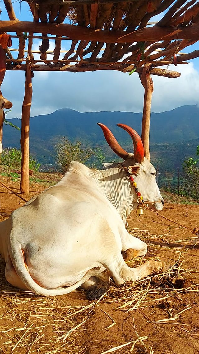 कालच्या भटकंतीत काही रूपवान पाळीव प्राणी भेटले. डोंगर धारेवरच्या झापावर शुभ्र सर्जा स्नान करून शिंगांना लाली लावून अगदी ऐटीत बसला होता.