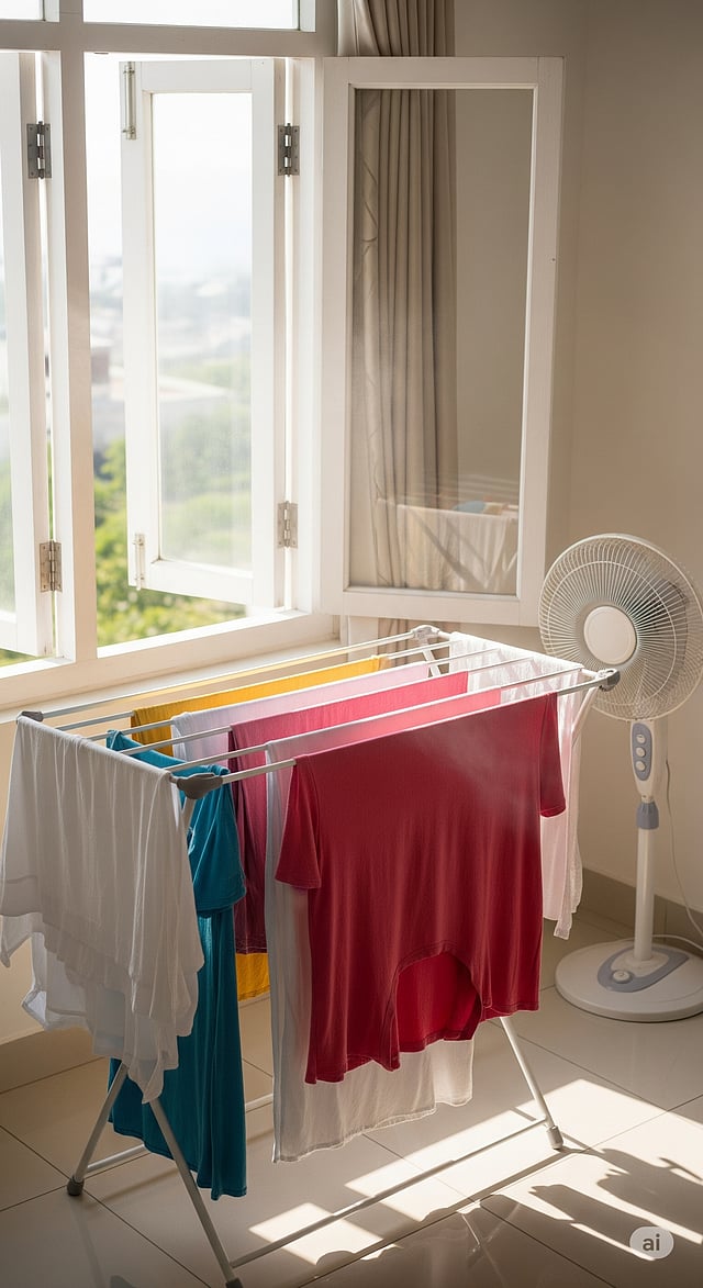 खिडकीजवळ, फॅनखाली किंवा एक्झॉस्ट फॅनच्या जवळ कपडे वाळवा.