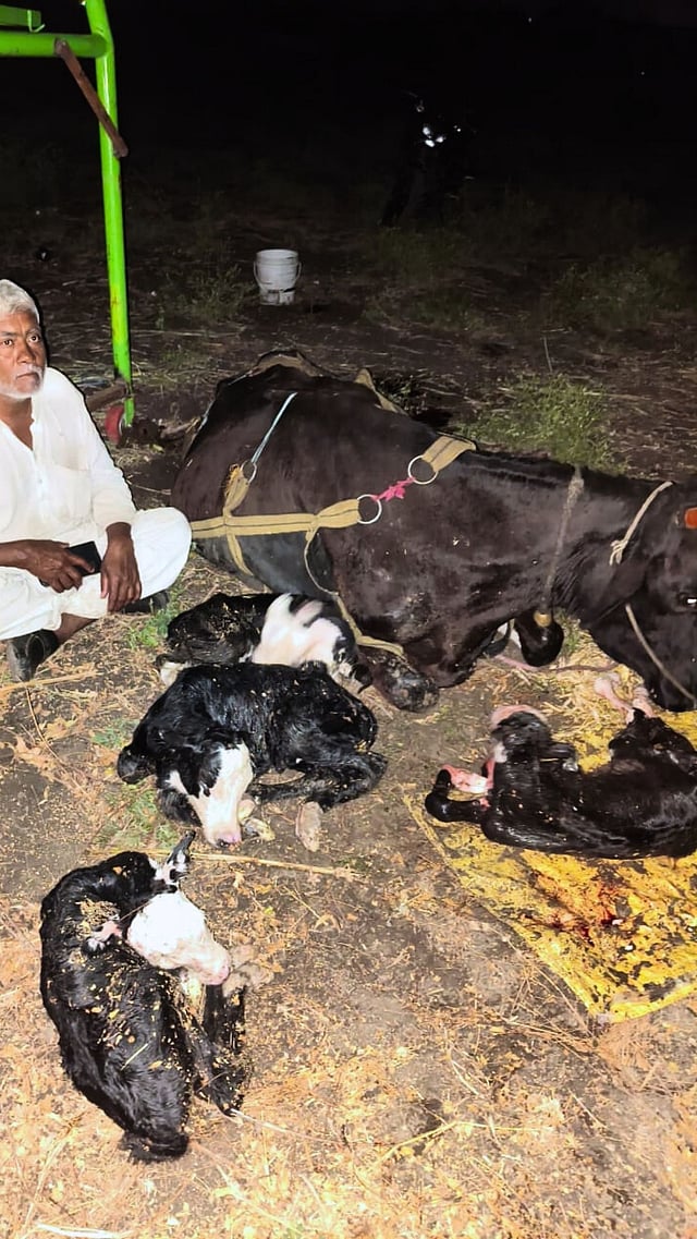 गायीने दोन कालवडी आणि दोन गोऱ्यांना जन्म दिला. एकाच वेळी चार वासरे होणे अत्यंत दुर्मीळ मानले जाते.