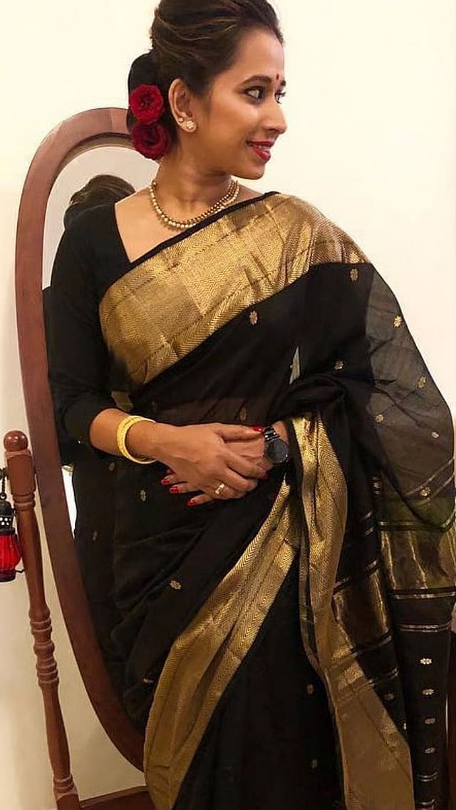 सोनेरी रंगाचे ब्लाऊज काळ्या साडीला एक शाही आणि मोहक लुक देते