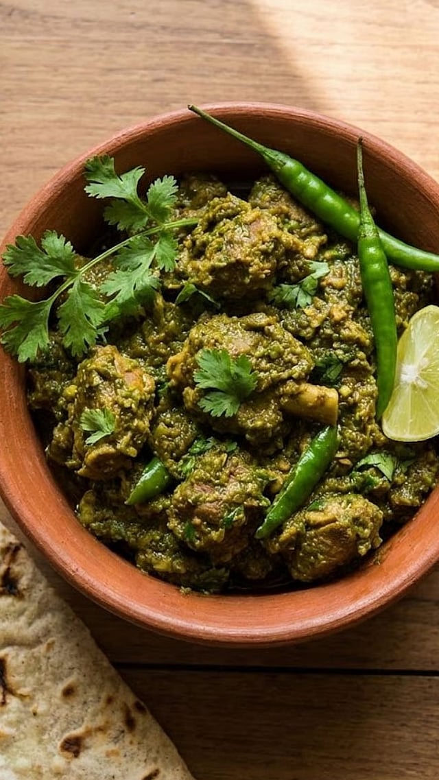 सर्वप्रथम मटणाला हळद आणि मीठ लावून मटण ७०-८० शिजवून घ्या. तेलात हिरव्या मिरच्या आणि लसूण भाजून घ्या. भाजलेल्या मिरच्या, लसूण, आले, जिरे आणि कोथिंबीर घालून जाडसर ठेचून घ्या.