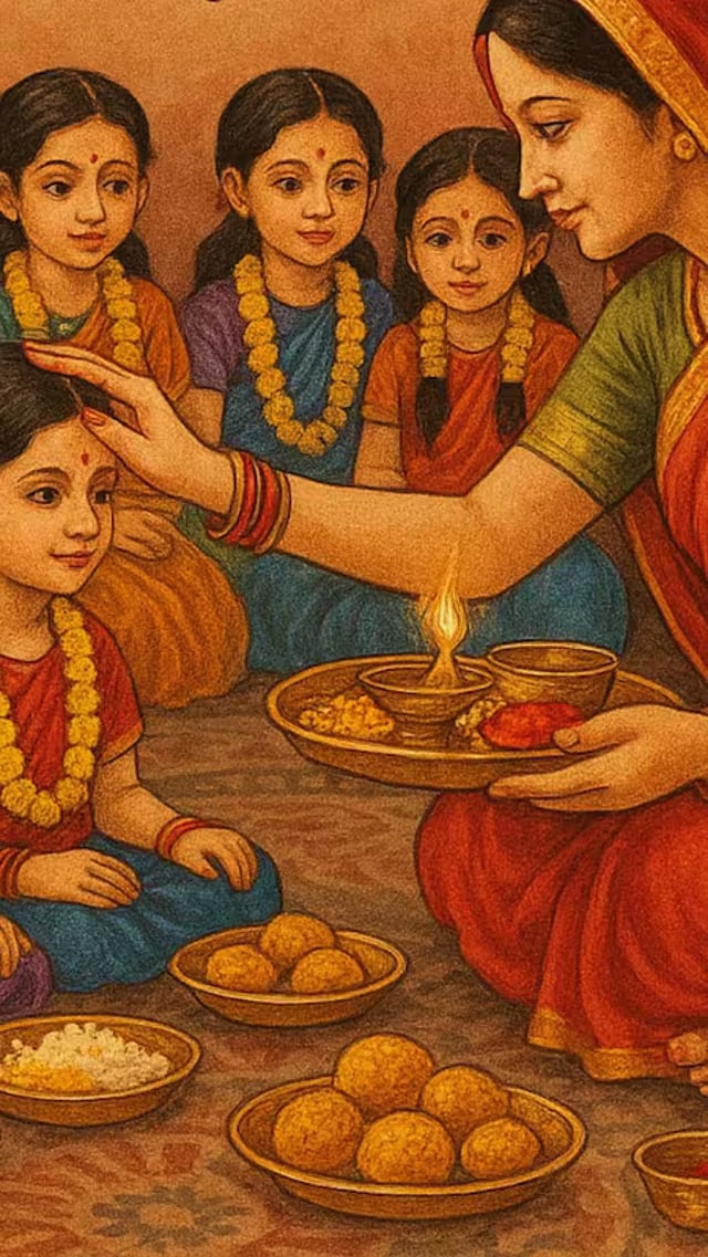 कन्या पूजनाच्या दिवशी लहान मुलींना भेटवस्तू, भोजन देऊन त्यांची श्रद्धेने पूजा केली जाते.