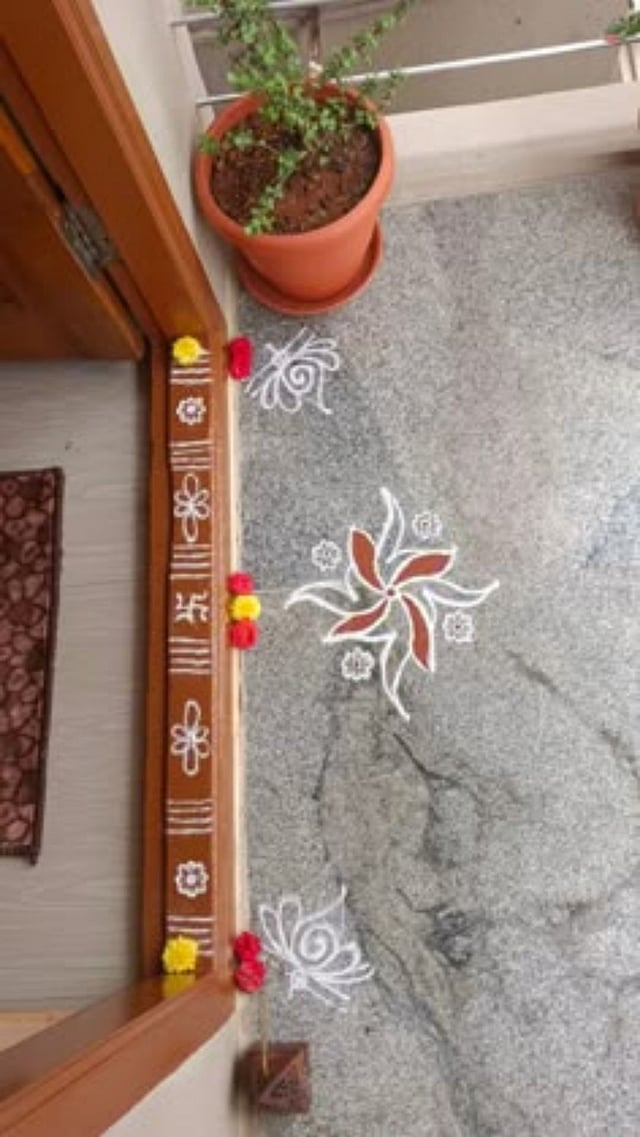 मध्यभागी स्वस्तिक किंवा ओम काढावा. उंबरठ्यावर थोडे अक्षता आणि फूल अर्पण करावे. उंबरठ्याजवळ अगरबत्ती किंवा तुपाचा दिवा ओवाळावा.