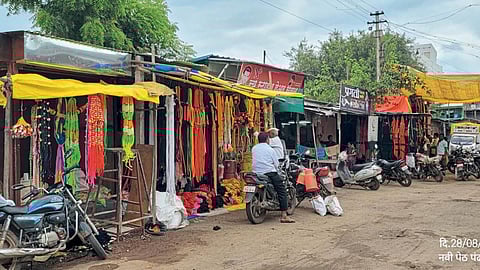 सोमवारी (ता. २) पोळा सण आहे. काळ्या आईची सेवा करणाऱ्या बैलजोडीची वर्षातून एकदा श्रावण अमावस्येला सजवून त्यांची खांदेमळणी, पूजा केली जाते. तसेच पुरणपोळीचा नैवेद्य खाऊ घातला जातो. त्या पार्श्वभूमीवर जिल्ह्यातील दक्षिण सोलापूर, अक्कलकोट या तालुक्यांसह मंगळवेढा, उत्तर सोलापूरचा काही भाग वगळता शहरांसह गावातील दुकाने सजली आहेत. कंडे, गोंडे, मोरक्या, रंग आदी विविध वस्तू विक्रीसाठी ठेवल्या आहेत. मात्र, बाजारात खरेदीसाठी शेतकऱ्यांची वर्दळ दिसत नाही.