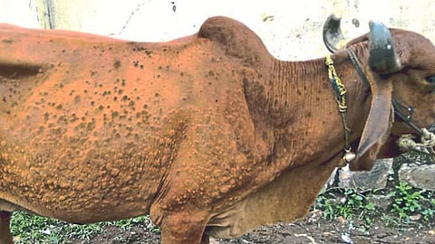 सोलापूर ः शिंगोर्णी (ता.माळशिरस) येथील तीन जनावरांना आधीच लम्पीस्कीनचा संसर्ग (lumpy Skin Infection To Livestock) झाला होता. त्यानंतर आता आणखी चार दुभत्या जनावरांना लम्पीस्कीनची बाधा (Lumpy Skin Infection To Milch Animal) झाली आहे. दोनच दिवसात गावातील सात जनावरांना या रोगाची लक्षणे (Lumpy Skin Disease Symptoms) दिसून आल्याने शेतकऱ्यांत चिंता आहे. दरम्यान, पशुसंवर्धन विभागाने लसीकरणाची मोहीम (Lumpy Skin Vaccination Drive By Department Of Animal Husbandry) वेगाने सुरु केली आहे. तसेच प्रादुर्भाव वाढत असल्याने सोलापूर जिल्हा नियंत्रित क्षेत्र म्हणून घोषित झाला आहे. गाय-म्हैस-वर्गाच्या प्राण्यांची वाहतूक, आठवडी बाजार, जत्रांमध्ये प्रदर्शन भरवण्यावर जिल्हा प्रशासनाने बंदी घातली आहे.