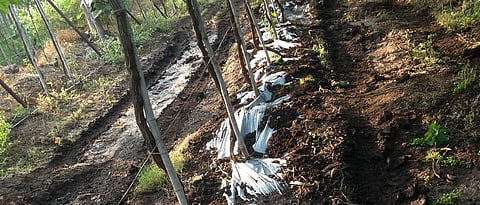 खरड छाटणीतील व फळ छाटणीतील पाणी व्यवस्थापनातील मुख्य फरक खरड छाटणीत घडनिर्मिती होण्यास पाण्याचा हलकासा ताण द्यावा लागतो, तर फळ छाटणीत पानांची, मण्यांची सतत वाढ करून घ्यायची असल्याने जमिनीत सतत वाफसा राहील, असे पाणी द्यायचे असते. या काळात पाण्याचा ताण पडू देऊ नये. मुरमाड जमीन - या जमिनीची पाणी धरून ठेवण्याची क्षमता खोल काळी जमिनीच्या तुलनेत फारच कमी असते. या कारणाने पाण्याच्या दोन पाळ्यांतील अंतर कमी ठेवावे लागते. तुलनेने पाणीही दीड ते दोन पटीने जास्त द्यावे लागते. या प्रकारच्या जमिनीचे दोन उपप्रकार पडतात. एका प्रकारामध्ये जमिनीमध्ये पाणी न पसरता सरळ खाली जाते. वरंब्यात ड्रीपरखाली फक्त नऊ ते दहा इंच पसरते. यामुळे त्या एक फुटाच्या कक्षेतील तंतुमय मुळे पाणी घेऊ शकतात. पूर्ण बागेत पसरलेल्या अन्य मुळांपर्यंत पाणी पोहोचत नाही. उत्तम घडनिर्मितीसाठी वरंब्याच्या दोन्ही बाजू मिळून दोन ते तीन फूट रुंदीपर्यंत पाणी काही काळापर्यंत पसरले पाहिजे. अशा जमिनीत इनलाइन प्रकारच्या दोन- लॅटरल लावाव्यात. दर १२ ते १४ इंचावर ड्रीपर असलेल्या दोन लॅटरलमधील अंतर हे दीड फूट ठेवावे. या पद्धतीने ठिबक सिंचन केल्यास अधिक जमिनीमध्ये ओलावा पसरतो किंवा गरजेनुसार पाणी देता येते. दुसऱ्या प्रकारच्या मुरमाड जमिनीत दोन तासांच्या दरम्यान पाणी दिल्यास आडवे पाणी (रुंदी - अडीच तीन फुटांपर्यंत) चांगले पसरते. वरील थरातील मुळांना मिळते. या प्रकारच्या जमिनीत गरजेनुसार दर तीन ते चार दिवसांच्या अंतराने पाणी दिले पाहिजे. ज्या वेळी बाग फुटत असते, अशा वेळेस या दोन्ही प्रकारच्या जमिनीला मोकळे पाणी देणे गरजेचे आहे. त्यानंतर सबकेन केले जाते. सबकेन फुटायला सुरुवात होते, त्या वेळी या दोन्ही प्रकारच्या जमिनीला सबकेन चांगले फुटण्याकरिता मोकळे पाणी देणे जास्त फायद्याचे ठरते. ठिबक सिंचनाने पाणी देताना... अ) मुरमाड जमीन खरड छाटणीनंतर पहिले चाळीस दिवस म्हणजे सबकेन फुटेपर्यंत ठिबक सिंचनाद्वारे पाणी देताना वरंब्यावर दोन्ही बाजू मिळून किमान तीन फूट रुंदीत पाणी पसरेल एवढे पाणी दर तीन ते चार दिवसांनी द्यावे. सबकेन फुटून २ ते ४ पानांवर आल्यावर दोन फूट रुंदीत पसरेल एवढे पाणी दिले पाहिजे. म्हणजे घडनिर्मिती करता मध्यम जोमाच्या फुटी वाढतात. ब) मध्यम प्रतीची जमीन वरील एक ते दीड फूट थर काळ्या मातीचा व त्यातील खाली मुरुमाचा असलेल्या जमिनीला मध्यम प्रतीची जमीन म्हणता येईल. यात वरील थरामध्ये पाणी धरून ठेवले जाते, तर खालील थरात अजिबात धरले जात नाही. अशा जमिनीत खरड छाटणीनंतर पहिले चाळीस दिवस वरंब्यावरील दोन्ही बाजू मिळून तीन फूट रुंदीत ओले होईल, एवढे पाणी दर सात दिवसांनी द्यावे. सबकेन फुटून २ ते ४ पानांवर आल्यावर द