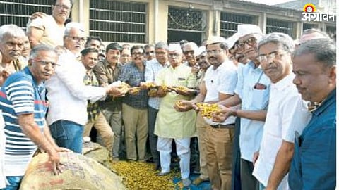 सांगली ः सांगली बाजार समितीत (Sangli Apmc market) मंगळवारी (ता. ३१) नवीन राजापुरी हळद सौद्यास (Turmeric Market) सुरुवात झाली. गणपती जिल्हा कृषी सोसायटीच्या दुकानातून सौद्यास सुरुवात झाली.