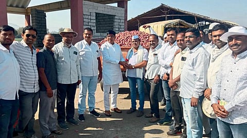या हंगामात प्रथमच देवळा बाजार समितीमध्ये उन्हाळी कांदा विक्रीसाठी दाखल झाल्याने कांदा उत्पादक शेतकरी सतीश आहेर यांच्या वाहनाचे पूजन करून शेतकरी श्री.आहेर यांचा संचालक मंडळातर्फे सत्कार करण्यात आला.