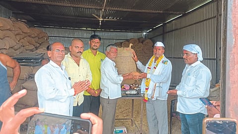 या वेळी बाजार समितीच्या वतीने शेतकरी लिंबाजी डोईफोडे यांचा हार शाल श्रीफळ देऊन सत्कार करण्यात आला. या वेळी बाजार समितीचे केंद्रप्रमुख राहुल गुजर आर. ए. शिंदे विलास गाढे दत्ता बिलोरे यांच्यासह शेतकऱ्यांची उपस्थिती होती. दरम्यान, बुधवारीही (ता. २७) बाजारात जवळपास १५ क्विंटल सोयाबीनची आवक झाली होती. तर दर ४७०० रुपये प्रतिक्विंटल स्थिर होता.