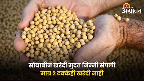 राज्यात सरकारने १३ लाख ८ हजार टन सोयाबीनची हमीभावाने खरेदी करण्यास मान्यात दिली. त्यापैकी पहिल्या टप्प्यात १० लाख टन खरेदीला मान्याता दिली. राज्यात खरेदी ९० दिवस चालणार आहे. खरेदीची प्रक्रिया १२ जानेवारीपर्यंत सुरु राहील. राज्यात प्रत्यक्ष खरेदी १५ ऑक्टोबरपासून सुरु झाली. म्हणजेच खरेदी सुरु होऊन ३९ दिवस झाले. मात्र आतापर्यंत २ टक्केही उद्दीष्ट पूर्ण झालं नाही. राज्यात आतापर्यंत केवळ २३ हजार ९२१ टन सोयाबीनची खरेदी झाली.