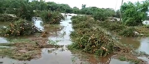 आटपाडी, जि. सांगली ः अवर्षण प्रवण असलेल्या आटपाडी तालुक्यात पावसाने कहर केला आहे. पावसाने आत्तापर्यंत साडेपाचशे मिलिमीटरची नोंद गाठली आहे. अतिपावसामुळे तालुक्याचे हुकमी फळपीक असलेल्या हजारो एकर डाळिंबाचे क्षेत्र पाण्यात बुडाले असून शेतीच्या इतिहासात यावर्षी सर्वाधिक विक्रमी नुकसान झाल्याचा अंदाज व्यक्त केला जात आहे. तीन महिन्यांपासून तालुक्यात सतत कमी अधिक पाऊस पडत आहे. दीड महिन्यापूर्वी सलग एक महिनाभर सूर्याचे दर्शन झाले नव्हते तर चार दिवसांपासून तालुक्यात पावसाने मोठा धुमाकूळ घातला आहे. अवर्षणप्रवण असलेल्या आटपाडीत विक्रमी ५५४ मिलिमीटर इतका पाऊस पडला आहे. सारया गावचे ओढे, नाले तुडुंब भरून वाहू लागलेत. अनेक गावचे अनेक पूल पाण्याखाली गेले असून वाहून गेले आहेत. या पावसाने मोठे नुकसान केले आहे. कौठूळी येथील किरण कदम यांची ओढ्यालगत डाळिंबाची बाग आहे. चार महिने बागेला हंगाम धरून झाले होते. ओढ्याला प्रचंड आलेले पाणी बागेत शिरले आणि डाळिंबाची झाडे पाण्याच्या प्रवाहाने उन्मळून पडली आहेत. त्यांचा या वर्षीचा हंगाम वाया गेला आहेच शिवाय डाळिंबाची पूर्ण भाग उद्ध्वस्त झाली आहे.