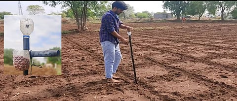 खरीप हंगामात कापूस लागवड ही टोकन पद्धतीने केली जाते. त्यासाठी दरवेळी वाकून बिया टोकाव्या लागतात. यामुळे काम करणाऱ्या व्यक्तींना पाठ, कंबर व गुडघेदुखीचा त्रास होतो. परिणामी कामांचा वेग मंदावतो. शारीरिक व्याधींही जडू शकतात. ही गरज ओळखून नाशिक जिल्ह्यातील देवारपाडे (ता. मालेगाव) येथील तरुण शेतकरी कमलेश घुमरे यांने बियाणे टोकन उपकरणाची निर्मिती घरगुती वस्तूंच्या साह्याने केली आहे. शेतीत संशोधक वृत्ती महत्त्वाची असते. वडिलांना शेतीत मदत करत असता कमलेश सातत्याने त्यांचे कष्ट कसे कमी करता येतील, याचा विचार करत असतो. कापूस लागवडीमध्ये बियाणे टोकण करण्याची कार्यक्षमता वाढविण्यासाठी त्याचे प्रयोग सुरू केले. घरामध्ये उपलब्ध पाइप, नळी, त्यास दोन वेल्डिंग रॉड अशा जुजबी साहित्यातून त्याने यंत्राची निर्मिती केली. त्यासाठी केवळ शंभर रुपयांपर्यंत खर्च आल्याचे कमलेशने सांगितले. या यंत्राने तूर, भुईमूग, मका अशा कोणत्याही बियांची टोकण करणे शक्य होते. कमलेश हा कलासक्त असून, अनेक लघुपटामध्ये अभिनय केला आहे. वडिलांना शेतीत मदत करण्यासाठी नवनवीन उपकरणे, यंत्रे तयार करण्याचा त्याचा प्रयत्न असतो. त्यामध्ये त्याला ‘ॲग्रोवन’च्या वाचनातून नव्या संकल्पना आणि प्रेरणा मिळत असल्याचेे कमलेश सांगतो. कमलेशने दोन वर्षांपूर्वी जुन्या सायकलीचा वापर करून पेरणी, कोळपणी व फवारणी करणारे बहुपयोगी यंत्र तयार केले होते. टोकण यंत्राची रचना अशी यंत्र बनविण्यासाठी एक इंच आकाराचा गोलाकार, ३ फूट लांबीचा पाइप वापरला आहे. वरील भागात बियाणे टाकण्यासाठी टाकाऊ बाटलीचे तोंड नरसाळ्याप्रमाणे कापून बसवले. त्यात हाताने एक किंवा दोन बिया (गरजेनुसार) सोडल्या जातात. या पाइपमधून बियाणे खालील भागात येते. येथे एक झडप बसवली आहे. तिथे बियाणे अडकते. टोकण करण्याच्या जागेवर पाइप योग्य खोलीपर्यंत पाइप जमिनीमध्ये रुतवला जातो. त्यातून झडप उघडण्यासाठी वरील भागापर्यंत एक दोरी किंवा तार जोडलेली आहे. ती खेचल्यानंतर झडप उघडली जाते व बियाणे खाली जमिनीत योग्य खोलीवर जाते. बियाणे मातीमध्ये कमी श्रमात योग्य खोलीपर्यंत जाण्यासाठी खालील झडप ही किंचित त्रिकोणी किंवा पक्ष्याच्या चोचीप्रमाणे बनवली आहे. टोकण यंत्र धरण्यासाठी वरील बाजूस दांडा दिला आहे. त्यामुळे यंत्राला स्थिरता येते व हाताळणे सोपे होते. शेजारी बियाणे ठेवण्यासाठी एक डबा जोडला आहे. त्यातून गरजेनुसार मूठ मूठ बियाणे काढून घेऊन वरील भागातील नरसाळ्यातून टाकू शकतो. संपूर्ण यंत्राचे वजन अवघे १ किलो असल्याने हाताळणीमध्ये शेतकऱ्यांवर कोणताही ताण येत नाही. फायदे