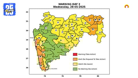 आज (ता. २७) रायगड, रत्नागिरी, सिंधुदुर्ग, सातारा जिल्ह्यांचा घाटमाथा, तसेच विदर्भातील नागपूर, भंडारा, गोंदिया, गडचिरोली जिल्ह्यांत जोरदार पावसाची शक्यता दक्षतेचा इशारा (रेड अलर्ट) देण्यात आला आहे. ठाणे, मुंबईसह पुणे, कोल्हापूर जिल्ह्यांचा घाटमाथा, हिंगोली, नांदेड जिल्ह्यांत जोरदार पावसाची शक्यता असल्याने, तसेच उर्वरित राज्यात वादळी पावसाची शक्यता असल्याने सतर्कतेचा इशारा (येलो अलर्ट) हवामान विभागाने दिला आहे.