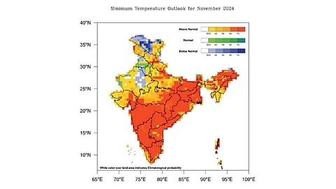 नोव्हेंबर महिन्यातील पाऊस आणि कमाल, किमान तापमानाचा अंदाज वर्तविण्यासाठी शुक्रवारी (ता. १) आयोजित पत्रकार परिषदेत हवामान विभागाचे महासंचालक डॉ. मृत्युंजय महापात्रा यांनी ही माहिती दिली. नोव्हेंबर महिन्यात वायव्य भारताचा काही भाग वगळता देशाच्या बहुतांश भागात किमान तापमान सरासरीपेक्षा वर राहण्याची शक्यता अधिक आहे.