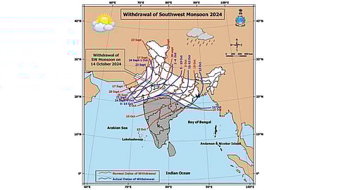 नैॡत्य मोसमी वाऱ्यांनी (मॉन्सून) २३ सप्टेंबर रोजी वायव्य राजस्थान आणि कच्छमधून परतीचा प्रवास सुरू केला. २४ सप्टेंबर रोजी राजस्थान आणि गुजरातच्या आणखी काही भागासह पंजाब आणि हरियानाच्या काही भागांतून मॉन्सून परतल्यानंतर मॉन्सूनची वाटचाल थबकली. २ ऑक्टोबर रोजी तब्बल आठ दिवसांनी मॉन्सूनने परतीचा प्रवास पुन्हा सुरू केला. ५ ऑक्टोबर रोजी मॉन्सूनने उत्तर प्रदेश, गुजरात, मध्य प्रदेशच्या आणखी काही भागासह, उ. महाराष्ट्र आणि अरबी समुद्राच्या आणखी काही भागांतून मुक्काम हलविला.