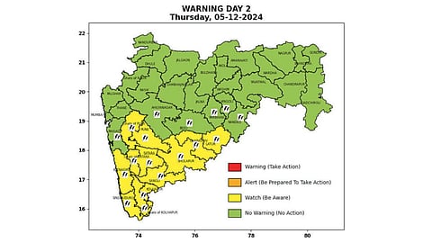आज (ता. ५) राज्यात आकाश ढगाळ राहण्याची शक्यता असून, किमान तापमानातील वाढ कायम राहणार आहे. कोकण, मध्य महाराष्ट्र, मराठवाड्याच्या दक्षिणेकडील जिल्ह्यांमध्ये तुरळक ठिकाणी विजांसह पावसाची शक्यता असल्याने सतर्कतेचा इशारा (येलो अलर्ट) हवामान विभागाने दिला आहे.