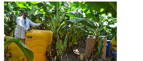 नांदेड जिल्ह्यात अर्धापुरी तालुका केळी पिकासाठी प्रसिद्ध आहे. मुदखेड तालुक्यातील बारड येथील शिवाजीराव रामराव देशमुख यांचेदेखील केळी हे पारंपरिक पीक आहे. शिवाजीराव यांचादेखील अनेक वर्षांच्या अनुभवातून या पिकात हातखंडा तयार झाला आहे. त्यांची एकूण २७ एकर शेती आहे. त्यापैकी सुमारे १० एकरांत ते दरवर्षी केळी घेतात. यंदा त्यांचे केळीचे क्षेत्र १८ एकरांपर्यंत आहे. केळीचे उत्पादन दरवर्षी ३५ ते ४० टनांच्या आसपास घेण्याचा त्यांचा प्रयत्न राहिलेला आहे. रासायनिक व सेंद्रिय अशा एकात्मिक पद्धतीने ते केळीचे व्यवस्थापन करतात. नेहमी चांगले उत्पादन मिळण्यामागे जमिनीची सुपीकता व उत्तम सेंद्रिय कर्ब या बाबी कारणीभूत असल्याचे शिवाजीराव सांगतात. केळी पिकातील व्यवस्थापन दरवर्षी ट्रॅक्टरद्वारे नांगरणी केल्यानंतर मोगडणी करण्यात येते. त्यानंतर एकरी आठ ट्रॉली चांगले कुजलेले शेणखत टाकून बैलाच्या नांगराने ते जमिनीत चांगले मिसळून घेण्यात येते. शेणखताचा वापर दरवर्षी होतो. यानंतर रोटर मारून ढेकळे बारीक करून घेण्यात येतात. विविध टप्प्यांत लागवड देशमुख दरवर्षी सुमारे चार टप्प्यांत किंवा वेगवेगळ्या बहारात केळीची लागवड करतात. जेणे करून एखाद्या बहारात दर चांगले न मिळाल्यास पुढील बहारात मिळू शकतात. त्यामुळे त्यांच्या शेतात केळीच्या वेगवेगळ्या अवस्था नेहमीच पाहण्यास मिळतात. लागवडीसाठी जी-९ जातीच्या टिश्यू कल्चरची रोपे वापरण्यात येतात. लागवडीपूर्वी प्रथम रासायनिक व नंतर जैविक रोपप्रक्रिया करण्यात आली. यात मेटलॅक्झील अधिक मॅंकोझेब व क्लोरपायरीफॉस यांच्या द्रावणात रोपांची मुळे बुडवण्यात येतात. ट्रायकोडर्मा, तसेच जीवाणूखतांचा वापरदेखील शिफारसीनुसार करण्यात येतो. खत व्यवस्थापन -लागवड सात बाय पाच फुटांवर केली आहे. प्रत्येक आठ दिवसाला जिवामृत शेणस्लरीची रोपांभोवती आळवणी करण्यात येते. लागवडीनंतर ३० दिवसांनी प्रति हजार झाडास १०० किलो डीएपी, ५० किलो पोटॅश, ८० किलो निंबोळी पावडर, ८० किलो भूसुधारक, २० किलो सूक्ष्म अनद्रव्य ही खते एकत्र मिसळून बांगडी पद्धतीने देण्यात आली. यानंतर ट्रायकोडर्मा या जैविक बुरशीनाशकाची फवारणी करण्यात येते. लागवडीनंतरदेखील प्रति हजार झाडांसाठीचे प्रमाण लक्षात घेऊन पोटॅश, युरिया, डीएपी, निंबोळी पावडर, सूक्ष्म अन्नद्रव्ये यांचा गरजेनुसार वापर करण्यात येतो. बुरशीनाशकांचा प्रतिबंधात्मक वापर नांदेड जिल्हा हा पारंपरिक केळी उत्पादक जिल्हा आहे. वर्षानुवर्षे केळी घेतल्यामुळे सिगाटोका रोगाचा प्रसार होण्याची शक्यता असते. त्यासाठी बुरशीनाशकांच्या प्रतिबंधक उपायांवर भर दिला जातो. पीलबागेचे नियोजन रोप लागवडीनंतर ८० टक्के केळी निसवली क
