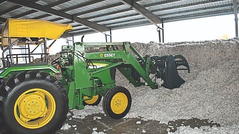 -लोडर ट्रॅक्टरद्वारे कापूस उचलून हॉटबॉक्समध्ये टाकला जातो.